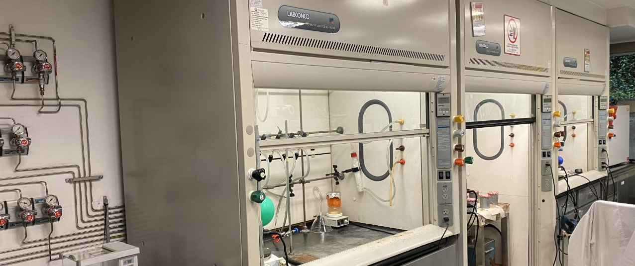 We are located in the Q building, lab 305. Our laboratory is equipped with traditional techniques for organic synthesis, such as fume hoods, rotavaps, inert gases, magnetic stirrers, hot plates, etc.