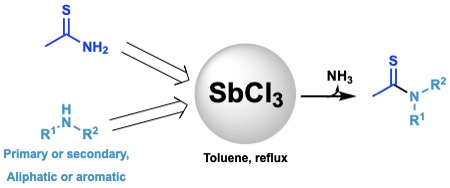 A transamidation reaction of thioacetamide with primary and secondary amines was described. The use of catalytic amounts of SbCl3 notably increases the yields and diminishes the reaction times.