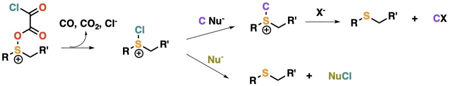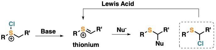 We generate thionium ions from chlorosulfonium salts, they usually react with chloride yielding α-chlorosulfides. The use of Lewis acids regenerates the thionium ion which reacts with carbon nucleophiles in cyclization reaction.