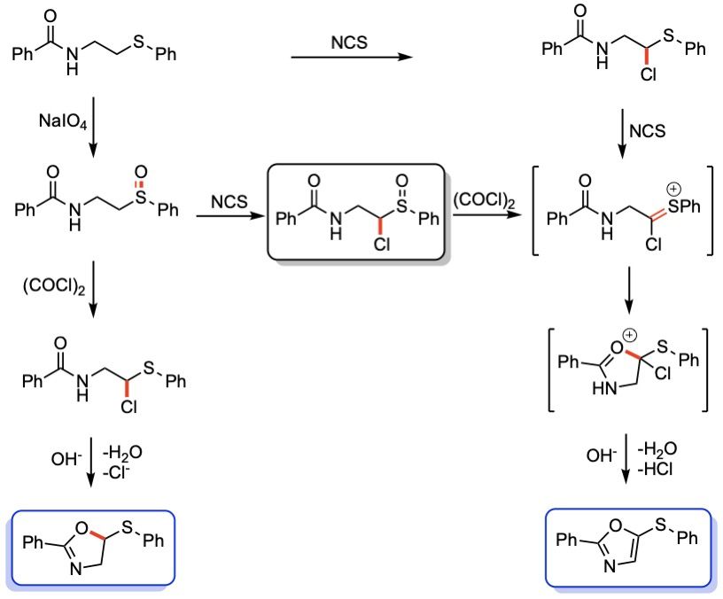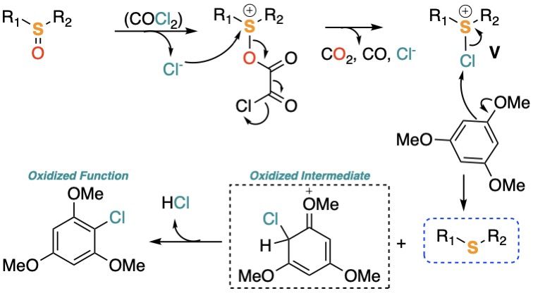 The use of (COCl)2 as Pummerer activator showed substantial activity producing α-chlorinated sulfides that can undergo Pummerer-Friedel Craft cyclization. If the aromatic ring has EDGs in position 3, the reaction follows a different pathway, yielding the reductive chlorination products where the chlorine atom comes from a sulfonium salt.